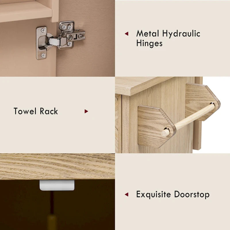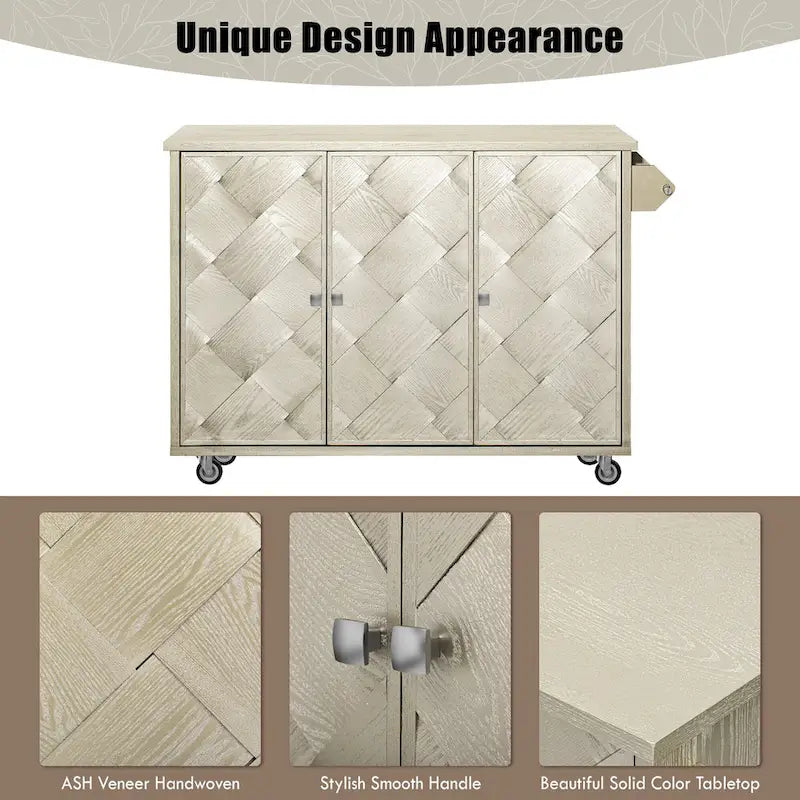 [Ash Veneer Handwoven Doors] Our modern coastal-style kitchen island retains the beauty of excellent natural aesthetic design and woven textures. The unique color appearance and wood grain texture of the ASH veneer door paired with a handwoven design. One will not be able to help but marvel at its unique take on aesthetics. The surface of the kitchen cart is painted in a very smooth and detailed finish that will stand the test of prolonged use and bring a longer lasting appeal to your kitchen.[Internal Storage Racks] Our rolling kitchen island features an internal storage rack design inspired by the functionality of refrigerator doors. These racks effectively optimize storage capacity while occupying minimal space, making them an ideal addition to kitchens, dormitories, offices, bedrooms, and dining areas.[Drop Leaf Design] The portable 46.5 D island features a drop leaf countertop, crafted from 0.98-inch thick premium MDF+ASH veneer, serving as an intelligent and efficient solution for compact kitchens or dining areas. The inclusion of the drop leaf table allows for effortless folding when not in use, thereby optimizing the utilization of available space.[Ample Storage Space] This kitchen island offers spacious cabinet space to accommodate your various basic items. This will ensure that your countertop space is not cluttered. In addition to this, the adjustable shelves in the cabinets and the internal storage racks behind the doors will allow you to place different sized items according to your needs, and towels have a special side towel rack for hanging. This kitchen storage cart will surely be effective in reducing your kitchen storage stress.