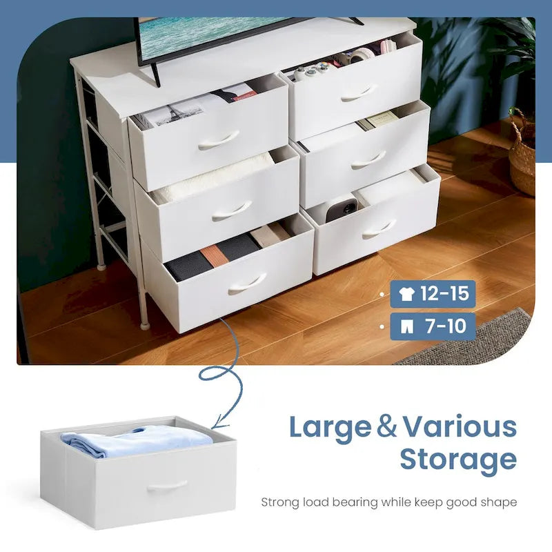 This premium clothes organizer mixes classic and modern designs, allowing it to blend seamlessly with any decor style in your home, and perfectly fit as a kid's dresser, baby dresser, bedroom dresser, closet dresser, and nursery dresser.For easy storage, 1 size of storage space drawers are offered. These 6 foldable deep drawers are spacious enough to provide endless organizational possibilities. The wooden top of the dresser organizer is great for lamps, clocks, glasses, and other daily essentials, keeping them within your reach.This chest of drawers is equipped with premium metal rails and durable storage drawers. The tall dresser is made of high-quality MDF board material (Capacity: 66lb) and is not easy to deform. The surface of the wooden dresser is smooth and easy to clean.The bedroom storage cabinet is equipped with a thickened and durable steel frame for long-lasting construction. It comes with triangular support bars and anti-tipping accessories to prevent accidents.