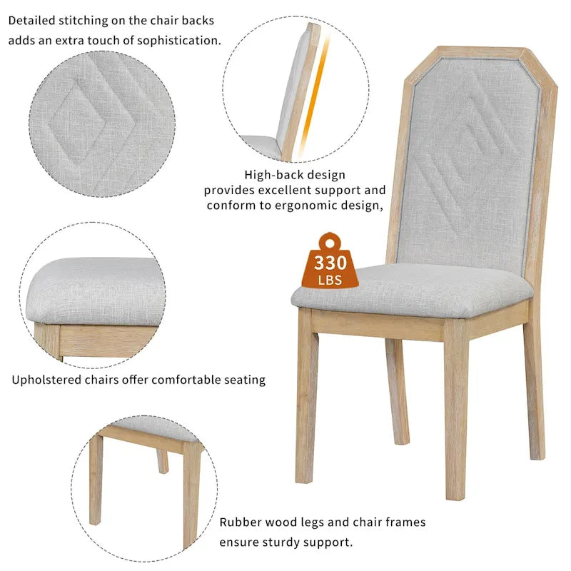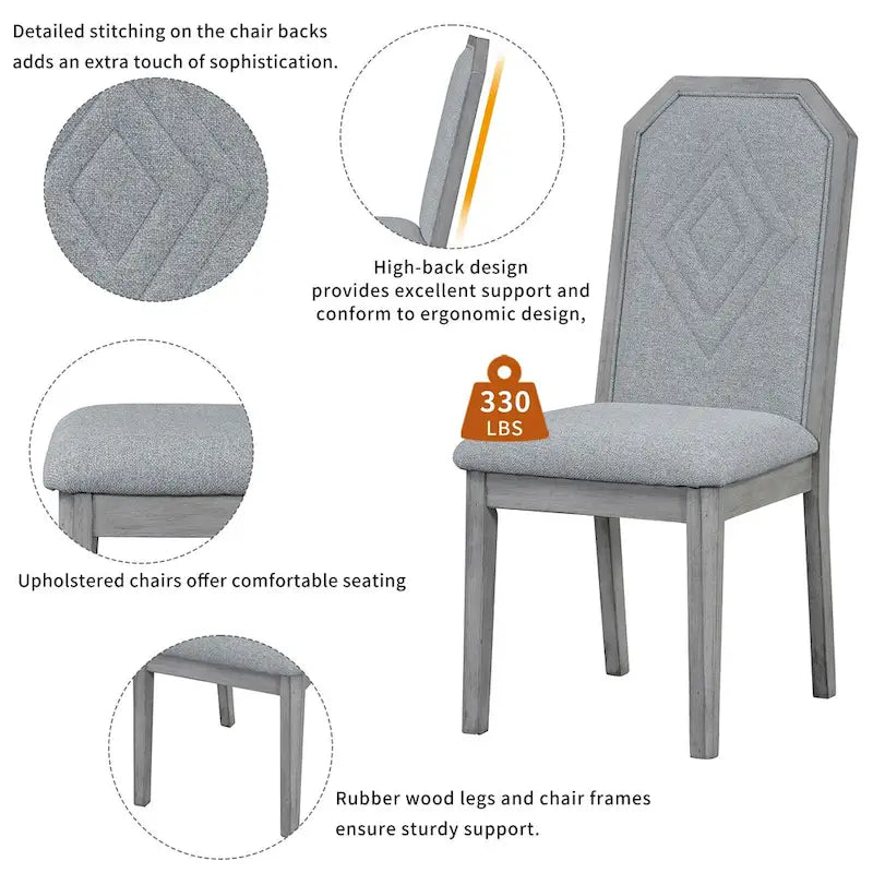 Comfortable and Stylish Seating: Upholstered chairs offer comfortable seating with a stylish design. While the detailed stitching on the chair backs adds an extra touch of sophistication. The high-back design provides excellent support and conform to ergonomic design, enhancing both comfort and style during meals. Weight capacity of chair: 330 lbs.