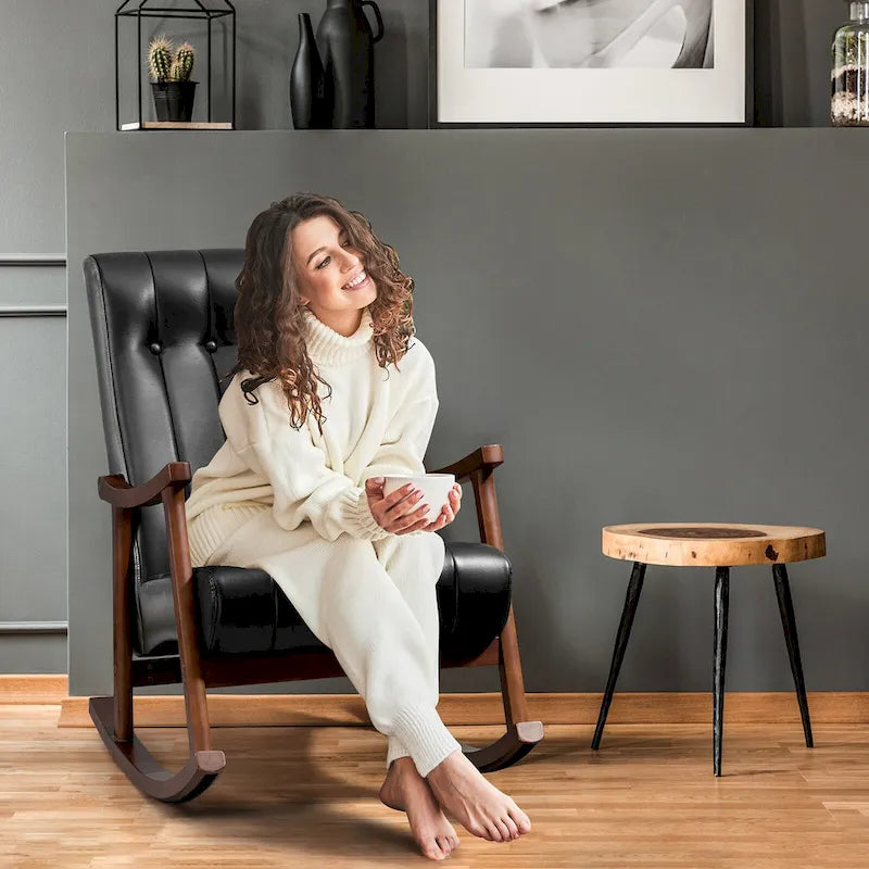 It's true that rocking chairs have a timeless appeal and can bring a sense of comfort and relaxation to any home. The high backrest and extra comfortable cushion of the rocker are key features that provide unparalleled comfort for the user. The ergonomic design that fits the body perfectly ensures that the user can relax and unwind in a comfortable position. The specially designed curved base with the perfect angle adds to the overall comfort and relaxation experience, allowing for a soothing rocking motion. The high-quality rubber wood used in the construction of the rocker ensures durability and sturdiness, making it suitable for long-term use. With a solid and durable structure, the rocker can provide years of comfort and enjoyment for the user.