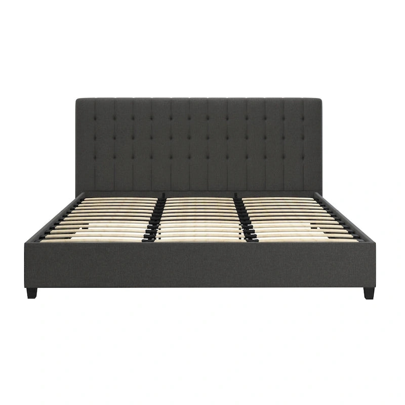 - Space Saving: Designed to maximize bedroom space, this modern low profile upholstered bed frame rests on faux wood legs and features an elegant tufted headboard with vertical stitching.