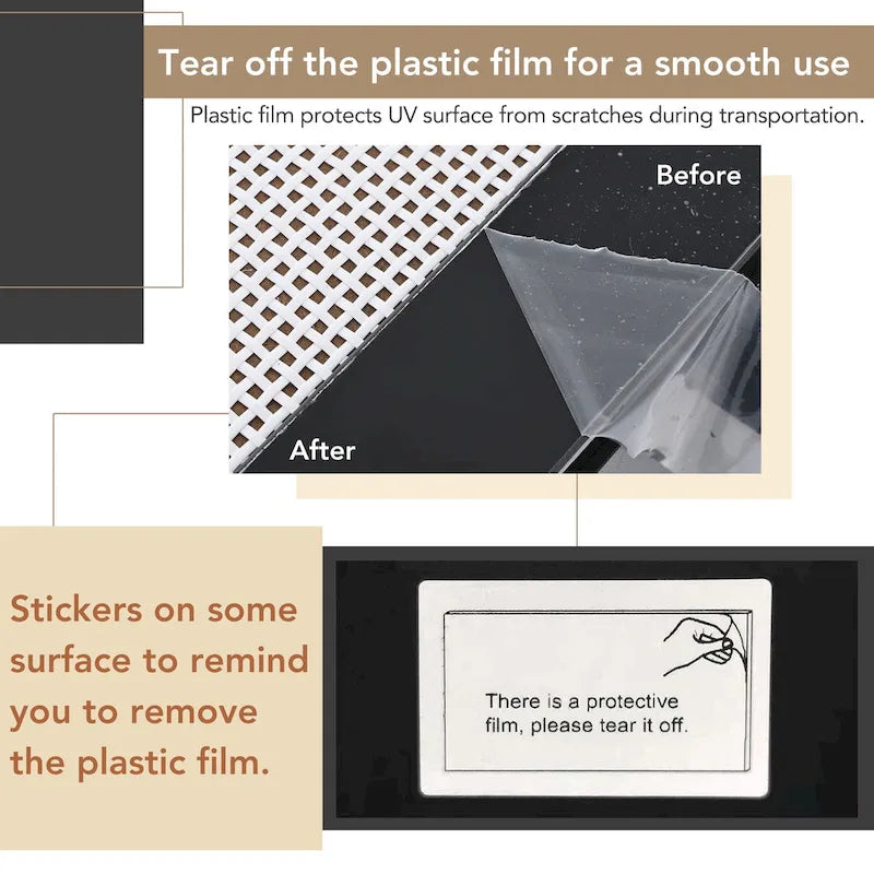 - NoticeThe plastic film for protecting UV from scratches should be teared off before put into use. If there is light dust on the edge, it can be wiped with a wet rag.