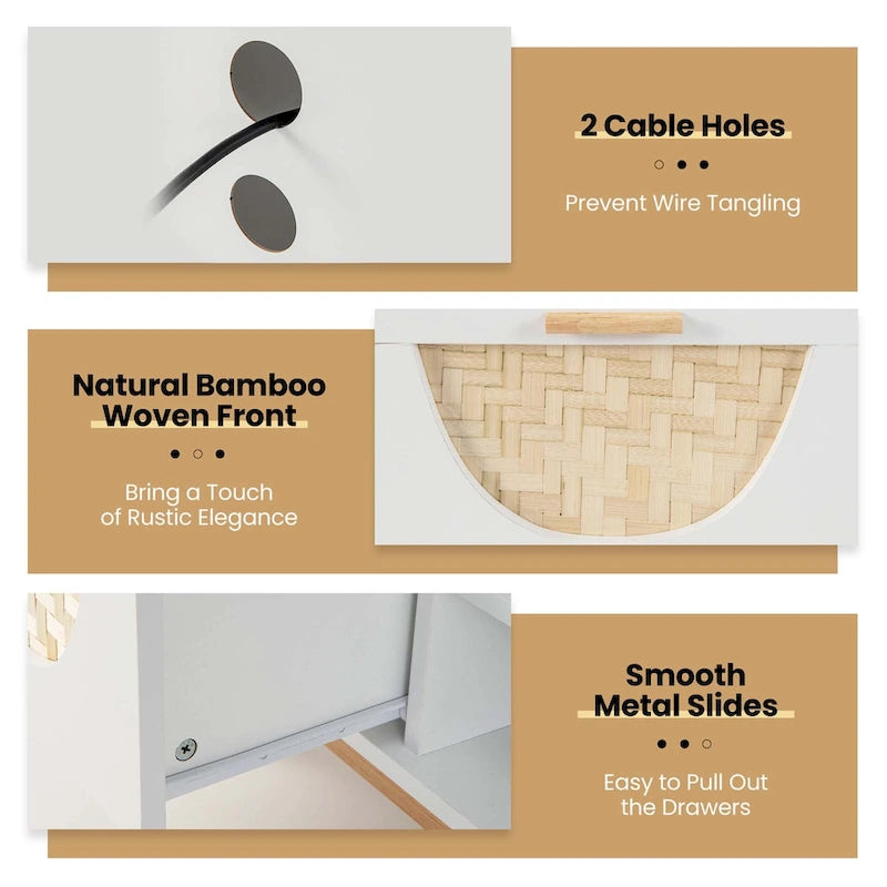 Transform your home with our chic TV stand, blending breezy rustic vibes with the sleekness of mid-century modern design. Imagine your 32/43/50/55 flat screen perched atop a pristine white platform, complemented by drawers with bamboo-woven fronts. Organize with ease using generous drawers and showcase your tech on the shelves with cable holes at the back. Sturdy, elegant, and crafted for longevity, this cabinet with solid wood legs is not just a media center - its a statement piece doubling as a showcase unit for your treasures! Plus, it also comes with non-slip foot pads for floor protection! Elevate your room and simplify your life with this versatile marvel. Click now to invite effortless style and order into your home!