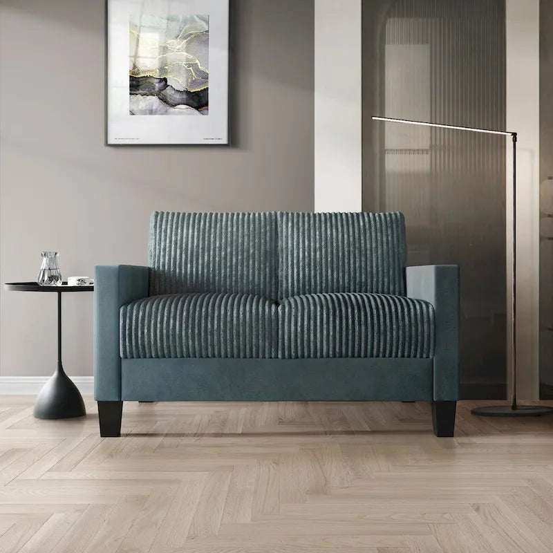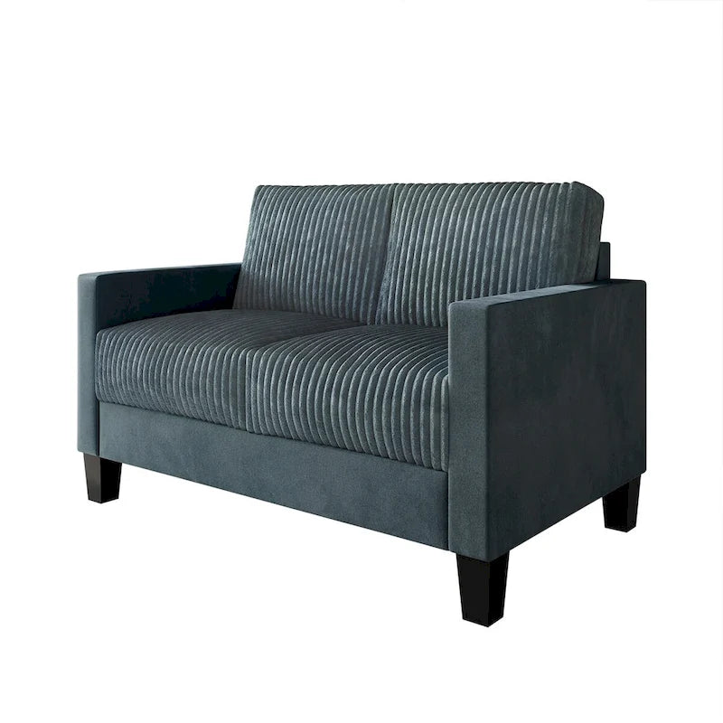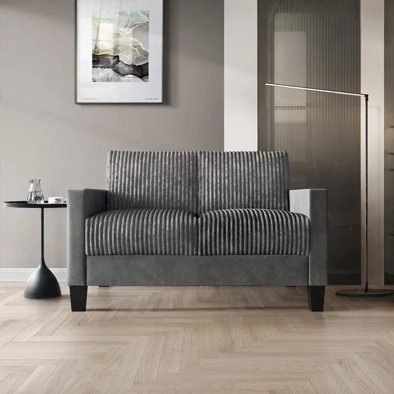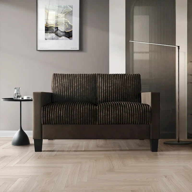 Redefine comfort and style in your living area with this luxurious loveseat, crafted with plush velvet upholstery and a sophisticated pleated design. This loveseat, featuring a chic corduroy upholstery, is a popular item that combines comfort with trendy style. The high-density foam cushions on the back and seat ensure unparalleled comfort, making it a perfect spot for relaxation. The sturdy plastic legs provide stability and durability, while the compact size makes it an ideal choice for smaller spaces. The loveseat features square armrests that add a modern touch and offer comfortable support. Available in a selection of elegant colorslight blue, grey, red, black, brown, and champagneit complements any interior style. Easy to assemble with all necessary hardware and instructions included, it's conveniently shipped in a single box