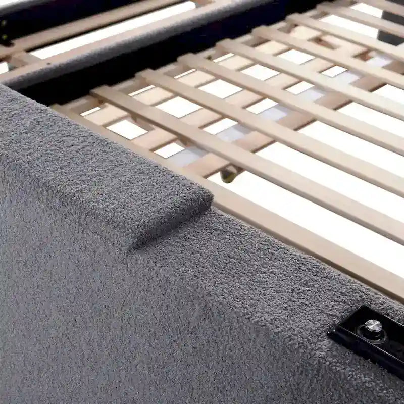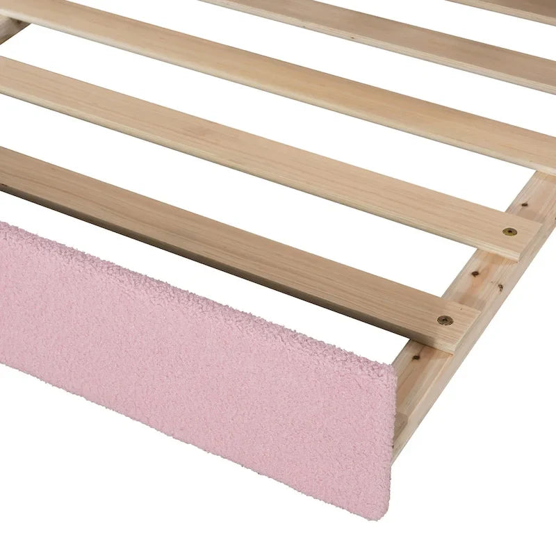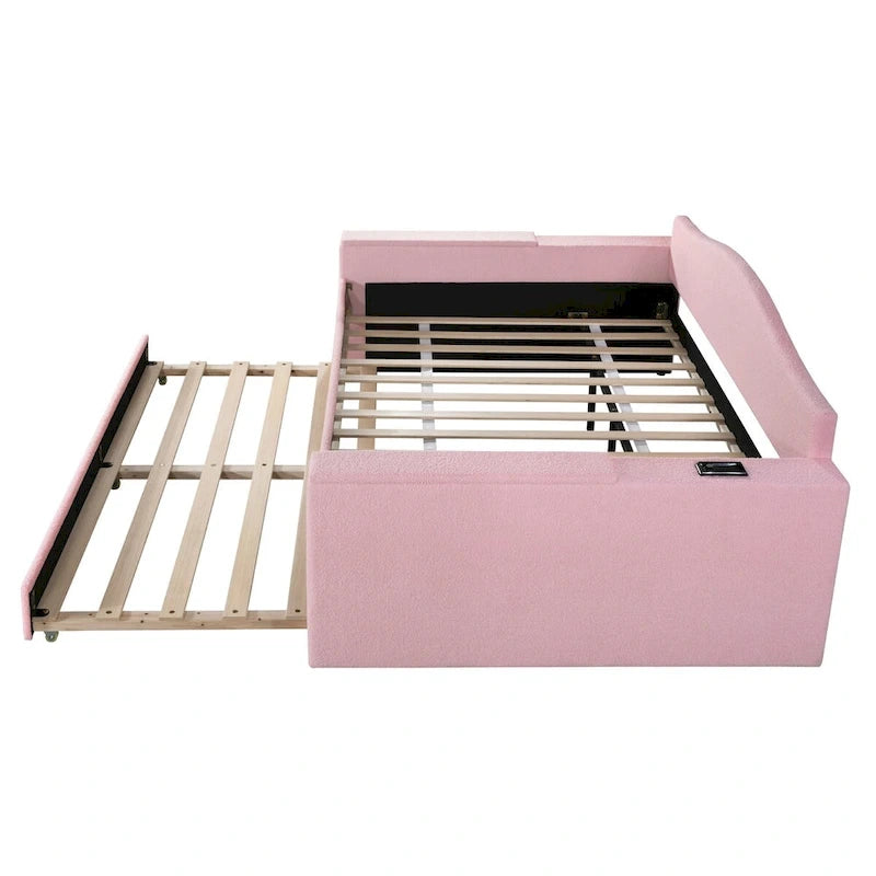 Equipped with Integrated Bluetooth Audio System and Storage Armrests, this bed provides a fun and adorable place for you to enjoy yourselves.Imagine yourself leaning on the daybed while listening some relaxing music and get some snacks at hand to eat.What a leisure time!This bed comes with a twin size trundle. Perfect for small apartment or someone who love sleepovers. Simply roll out the trundle when it is needed and roll in when it's not in use. This daybed will surely be a beautiful and practical piece for your bedroom.Product Features[Elegant Design] The modern profile of the bed track design acts as an eye-catching focal point which brings artistic atmosphere to your home.The design is full of fun and can make you feel easy and comfortable.[Integrated Bluetooth Audio System]The Bluetooth Audio equipped on the armrest is a novel and elegant design.You can easily connect to the audio system with Bluetooth on your phone and enjoy high-quality music which relieve your whole day's fatigue and enjoy such a relaxing and entertaining moment.The USB Port on the panel saves trouble for you to charge your electric devices.[Storage Armrest]This elegant daybed comes with storage armrests on either side, which is at hand for you to store and get your daily items, snacks and drinks.This humanistic design of the bed brings easy and comfortable living exeperience.[Space-saving] This bed comes with a twin size trundle. Perfect for small apartment or someone who love sleepovers. Simply roll out the trundle when it is needed and roll in when it's not in use.[Overall Dimensions] The day bed is delivered in 3 packages, along with the installation manual and full set of hardware necessary to guide you through the process of assembly.Overall Product Dimension: 87.2L x 57.5W x 35.4H. Mattress not included.Weight & DimensionsOverall Product Dimension 87.2L x 57.5W x 35.4HOverall Product Weight171.96 LBSWeight Capacity Bed:500LBS Trundle:500LBSRecommended Mattress Thickness 6Product Type Upholstered DayBedSize FullColorPinkMaterial Plywood+Teddy FleeceBox Spring Required NoMattress Included Nonumber of slatsBed:12 Trundle:6Avoid power tools YesNotes1.Manual measurement has been used, there may be some reasonable errort, thanks for your understanding.2.Due to factors such as display equipment and shooting environment, the color of the item may be slightly different from the picture, which is a normal phenomenon, please refer to the actual item3.Improper use of screws may cause the product surface damage! Please be careful when installing.4.It is recommended to put a layer of foam or soft cushion on the floor when installing to avoid scratching the floor.5.If the item has any defects, damage or missing parts, please contact us with pictures or videos so that we can understand your needs and help you quickly, and always remember to retain its original packaging to ensure any return requests. We will try our best to solve any problems you may have.6.If you receive the wrong product, please attach the product picture, the infographic of the outer package and the picture containing SKUs, so that we can verify and quickly deal with it for youKeep it looking its best1. Blot spills immediately with a clean, absorbent white cloth.2. Avoid direct sunlight.3.Spot clean using distilled water and water-based cleaning agents, foam or mild water-free cleaning solvents. 4. Always test a small inconspicuous area first.5.Hardware may loosen over time; periodically check to make sure all connections are tight