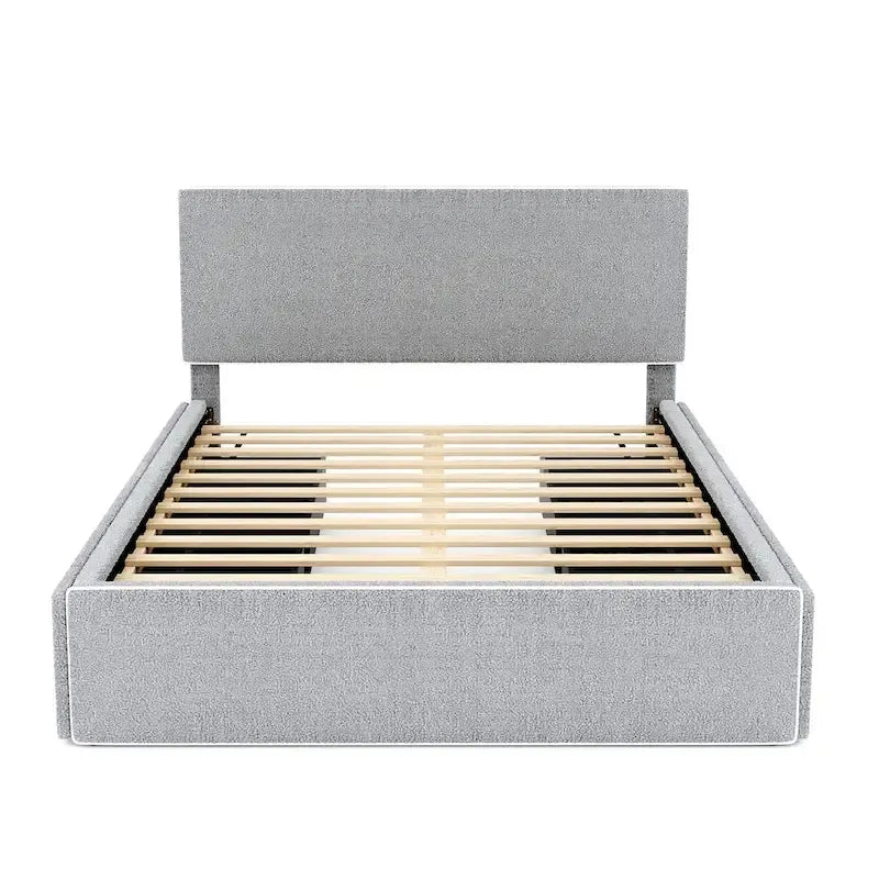 This beautiful Upholstered Platform Bed adds a contemporary chic look to your bedroom and is upholstered in fleece fabric to add extra comfort. Sturdy wood frame construction and a wooden slat system to add extra stability and safety.The upholstered platform bed with four drawers can easily be pulled in and out for maximum storage space, perfect for organizing anything from clothes and bed linens to toys and games.
