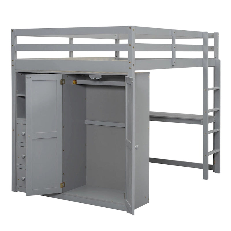 Full Solid Wood Loft Bed with Wardrobe & Desk