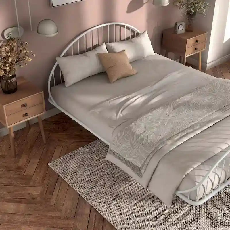 Transform your bedroom with our stylish metal bed frame, featuring a powder-coated finish and round tubing for a modern look. With sturdy metal slats and six T-shaped legs, this frame provides exceptional support and stability. Ideal for any living space, it offers convenient under-bed storage and eliminates the need for a box spring.