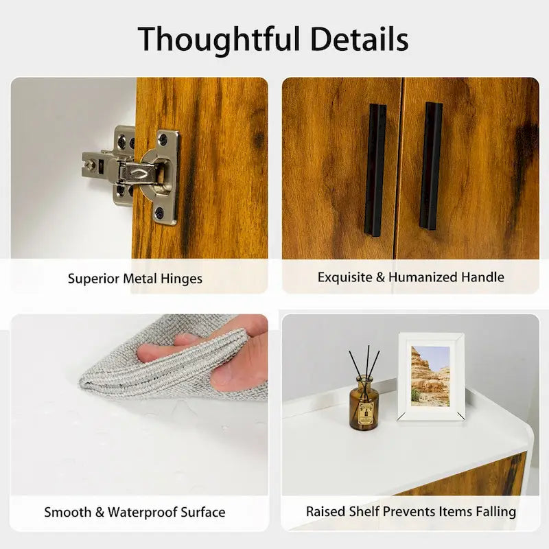 Our modern floor storage cabinet will bring convenience and elegance to your life! This elegant and multifunctional 2-door side cabinet is a perfect combination of practical storage and home decoration, which can be placed in the bedroom, living room, entryway or anywhere you need. The rustic brown wood grain surface of the doors creates a retro atmosphere, making your home no longer monotonous. The spacious tabletop offers ample space to place various daily essentials with easy access. Besides, there is a partition in the middle of the cabinet, making it easy for you to store sundries in great order. This sideboard cabinet is made of premium MDF and powder coated metal legs, ensuring great stability and durability.