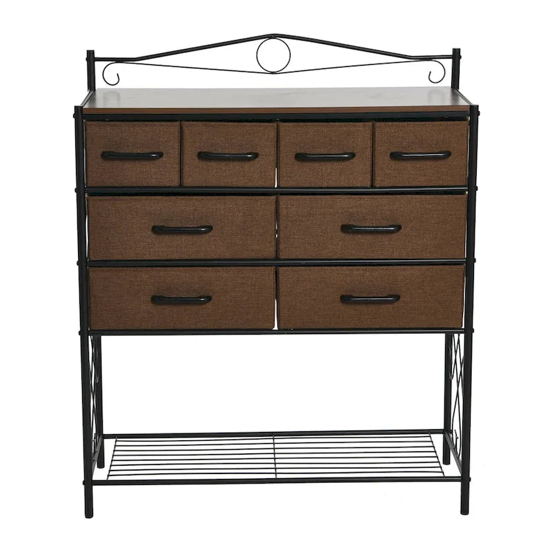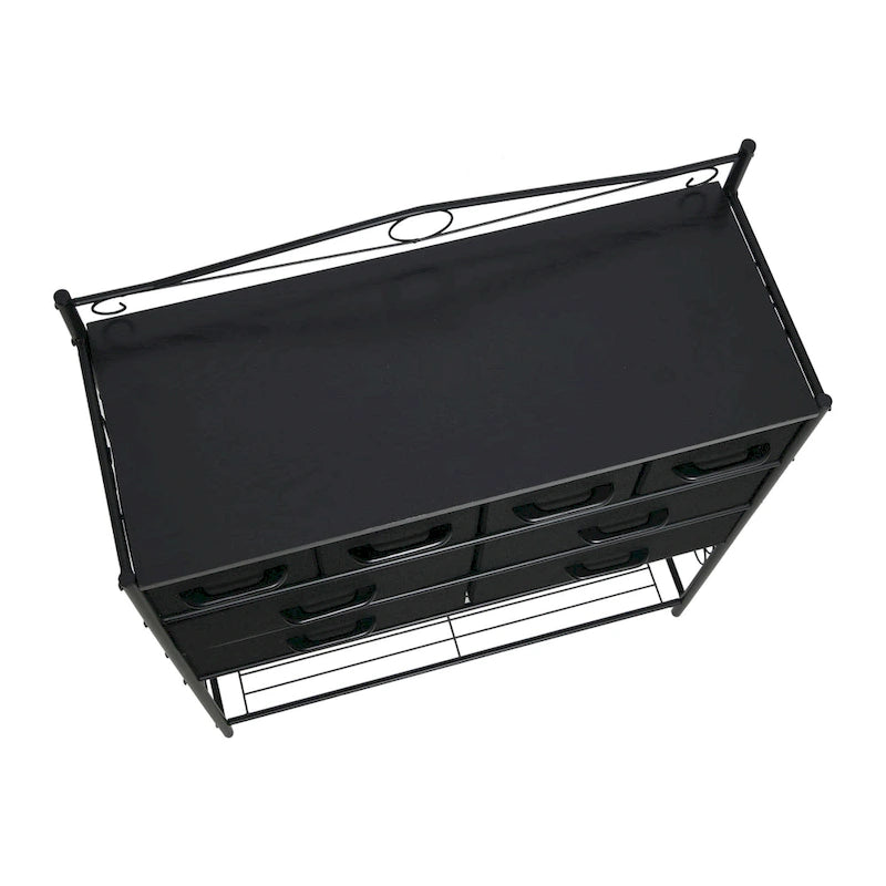 This elegant and versatile wide dresser offers multifaceted storage solutions for any space in your home. With a top shelf, small and large drawers and a lower storage rack, this dresser has a variety of available storage solutions, and the neutral colors and delicate metal detailing are well-suited to blend with different decor styles. The dresser has a metal frame with scrolling victorian detailing, giving the dresser a frame that is stylish and sturdy while still being lightweight. The top of the dresser is finished with an engineered wood shelf with a laminate finish and a decorative metal back for additional storage space. The dresser comes with 4 small drawers (5.5 inches high, 8 inches wide and 12.5 inches deep) and 4 large drawers (5.5 inches high, 15.75 inches wide and 12.25 inches deep) that can be rearranged to create a variety of different looks or uses. The bottom portion of the dresser's frame includes a metal rack that can be utilized in a variety of ways depending on where and how you plan to use this unit. The rack can hold additional storage bins or baskets, shoes, blankets and more. This wide dresser would be a perfect addition to a room or closet to hold clothing, accessories and shoes, or as a credenza or console in the living room or dining room. Use it in an entryway to hold seasonal accessories such as scarves, sunglasses and hats, shoes, pet accessories, reusable shopping bags or anything else you need to grab or drop when leaving or entering your home. The top shelf is a perfect spot for incoming or outgoing mail, catchalls for keys or change or a charging station for phones, tablets or fitness trackers and watches. Part of the Household Essentials Victoria Collection. Comes ready to assemble and is easy to put together.