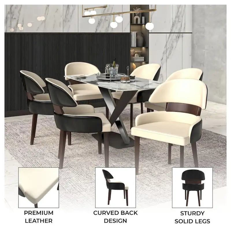 Introducing the LeisureMod Modern Dining Chairs from the Ethos Collection, a perfect blend of luxurious style and comfort. These chairs feature beautifully cushioned vegan leather upholstery on both the seat and curved back, offering water and scratch resistance for effortless maintenance. The sleek design adds sophistication to any dining space, while the solid wood frame provides exceptional stability and durability. Each leg has rubber pads to protect floors and ensure smooth, scratch-free movement across hardwood, tile, or carpet. Versatile and stylish, these chairs integrate seamlessly into any setting, from formal dinners to casual gatherings. Plus, with no assembly required, you can enjoy these chairs straight out of the box for a truly hassle-free dining experience.