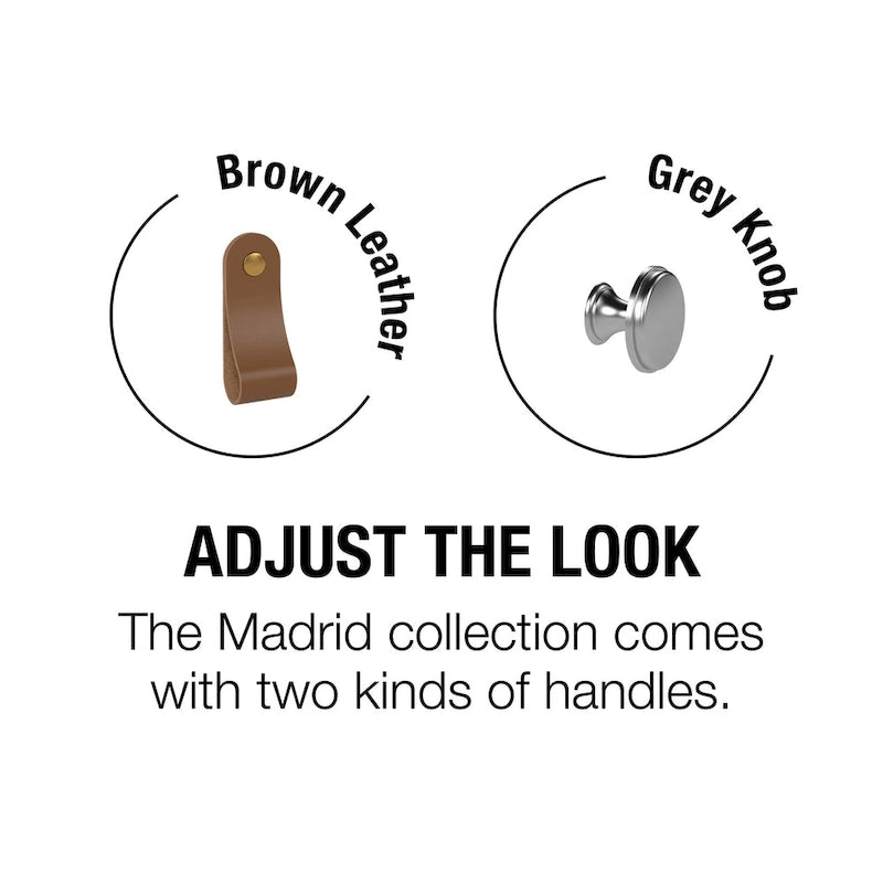 - Comes with two types of handles: grey knobs and leather handles