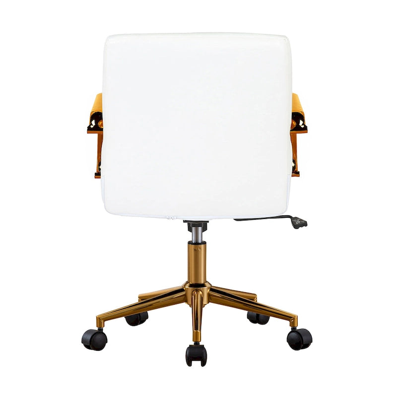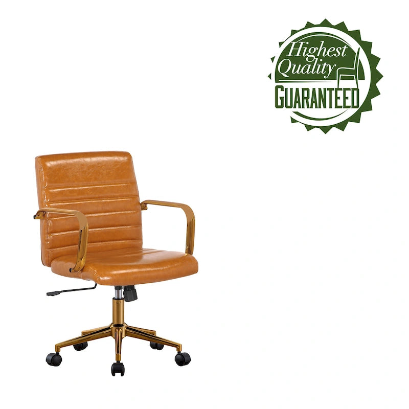 Introducing the Porthos Home Franco Swivel Office Chair, the perfect combination of style and comfort for your workspace. Upholstered in water and stain-resistant PU leather, its mid-height back is ergonomically designed to provide support and reduce aches and strains. With its golden armrests and gilded metal legs, this chair adds a touch of luxury to your office while still being functional. The chair height is easily adjustable with one push of its lever, and with a 360-degree swivel and smooth-rolling caster wheels, you'll have the freedom to move around your workspace effortlessly. Available in 16 and 19-inch back heights, the Porthos Home Franco Swivel Office Chair is simple to assemble and has a weight capacity of 265 lbs.