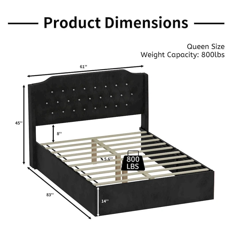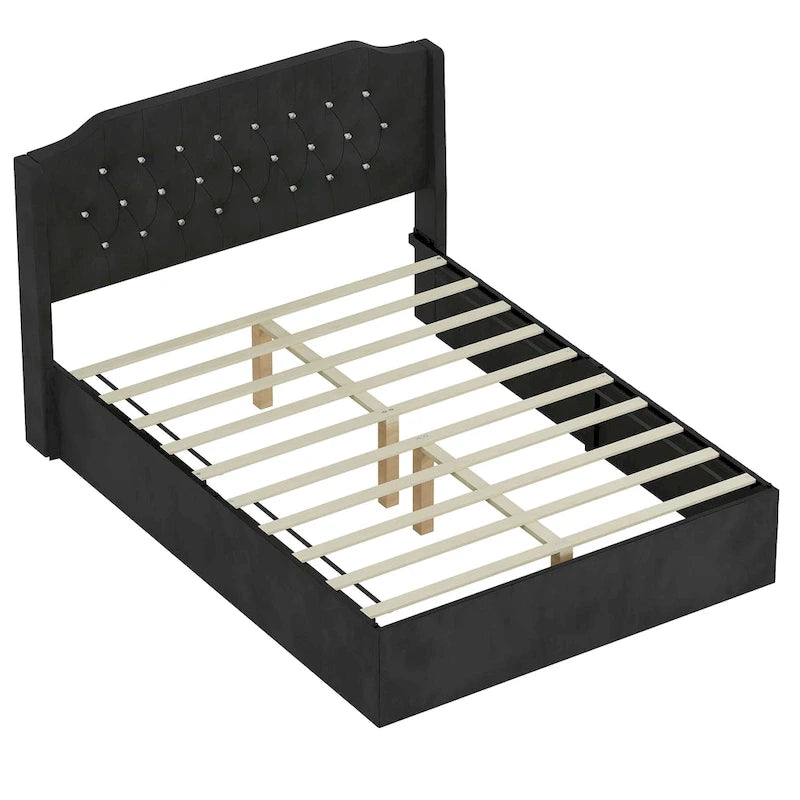 Elevate your bedroom with this luxurious Queen-size Upholstered Bed Frame, blending elegance with smart functionality. The tufted velvet wingback headboard with crystal button accents creates a lavish focal point, while practical features like removable Velcro side covers and under-bed storage enhance everyday convenience. Designed for both style and durability, this bed frame offers a perfect balance of sophistication and practicality.