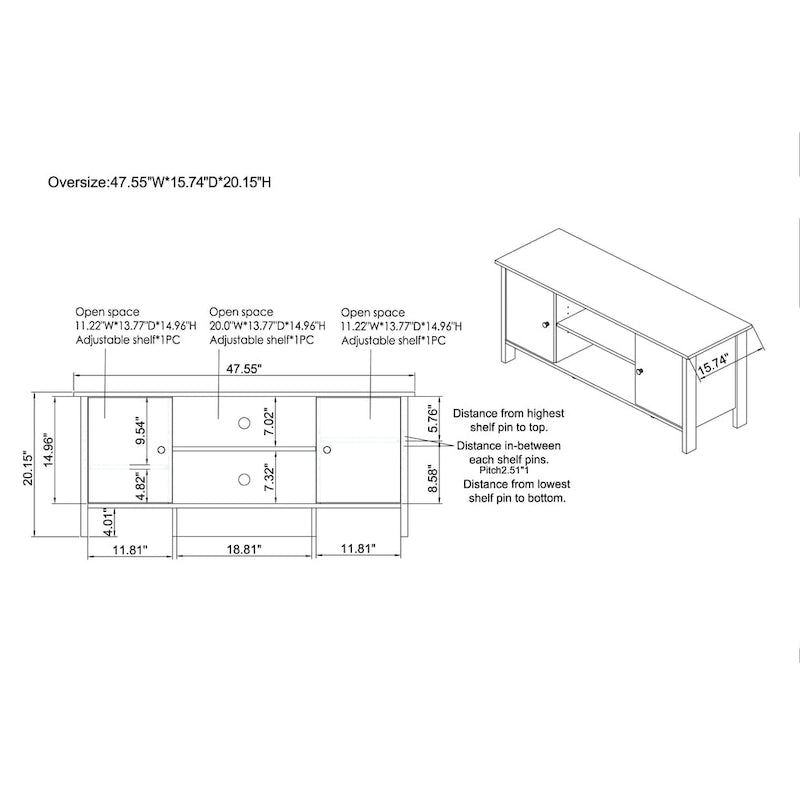 - Overall: 20.15 inches high x 47.55 inches wide x 15.74 inches deep